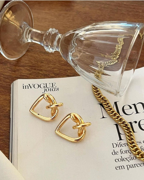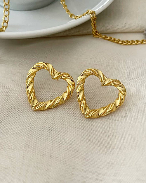 Brinco Folheado a ouro 18k dourado coração torcido vazado.