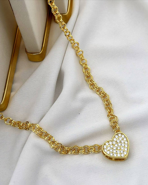 Colar Folheado a ouro 18k Elos duplos coração todo cravejado.