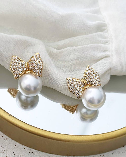 Brinco Folheado a ouro 18k Laço cravejado com pingente de pérola.