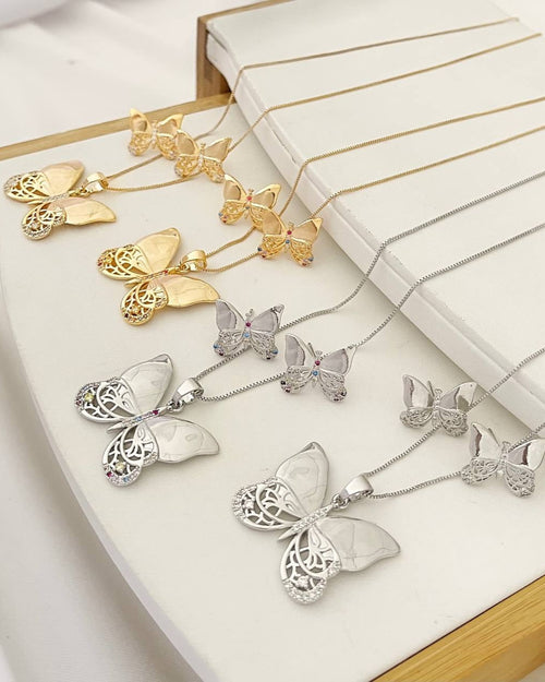 Conjunto Borboleta cravejado com zirconias coloridas folheado a prata e folheado a ouro 18k .
