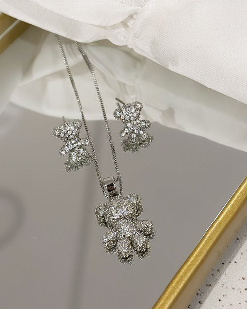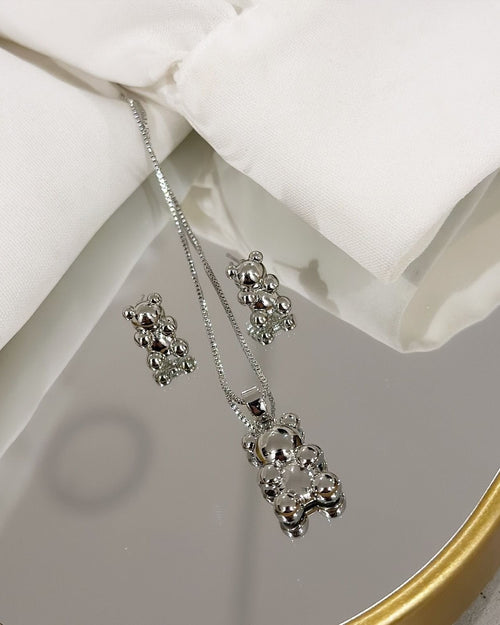 Conjunto Ursinho Taddy cravejado com zirconia Folheado a ouro 18k e folheado a prata.