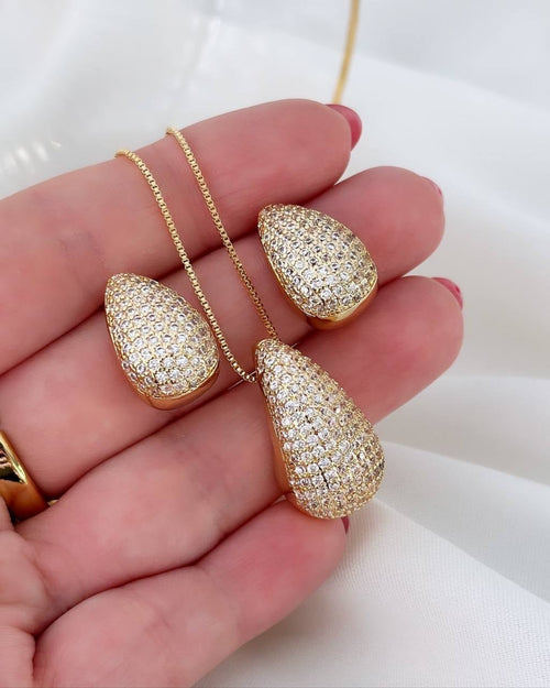 Conjunto Folheado a ouro 18k Gota cravejada com zirconia.
