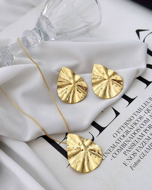 Conjunto Folheado ouro 18k Esfera Martelado detalhado.