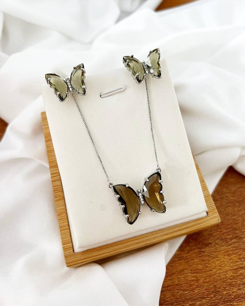 Conjunto Borboleta Folheado a prata com zirconia fume e zirconias cravejada.